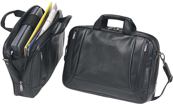 Made of fine black Napa cowhide, this compact case holds your computer in a padded sleeve with additional padding for extra safety. Inside is a full-size zip pocket, along with additional pockets for CDs, PDAs, a power pack, cards and pens. Front and back outside zip pockets, and detachable shoulder strap. Measures 17" x 12" x 3 1/2". The debossing area, on the front panel, is approximately 4 1/4" x 2 3/4".