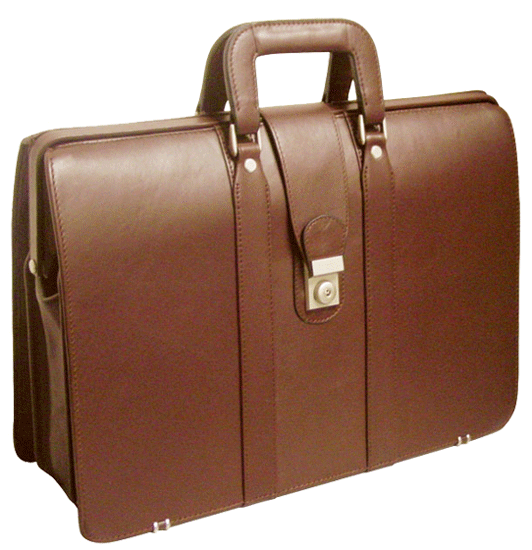 Made of drum-dyed full-grain cowhide leather, this case features triple compartments, and a unique metal frame that allows the case to remain open for easy access. The middle compartment is padded to accommodate a laptop, and an inside organizer holds CDs, PDAs and pens. A three-step key lock with buckle strap completes this exceptional piece. 18" x 12 1/2" x 7". Available in tan.