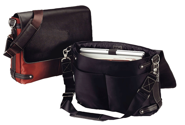A handsome combination of Napa leather and sleek, fine-weave nylon, this contemporary brief will accommodate a laptop up to 17". Lift the flapover magnetic closure to reveal countless functional features, including dual front pockets, with places for a phone, USB, PDA and pens, and a generous main compartment with padded laptop sleeve, zip pocket, and countless additional pockets for all your business accessories. An open pocket in the back. Includes a padded adjustable, detachable extra-wide shoulder strap. 16" x 13" x 4 1/4". Offered in black or rust.