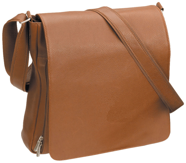 Made of supple Napa cowhide, this posh vertical piece is perfect for travel and daily use. The sleek, flap-over design features a zip-down organizer in front to accommodate a PDA, notes, cards, pens and incidentals. The spacious main compartment has an additional zip pocket inside. An open pocket in the back and adjustable shoulder strap complete this handsome piece. 12" x 13 1/2" x 3 1/2".