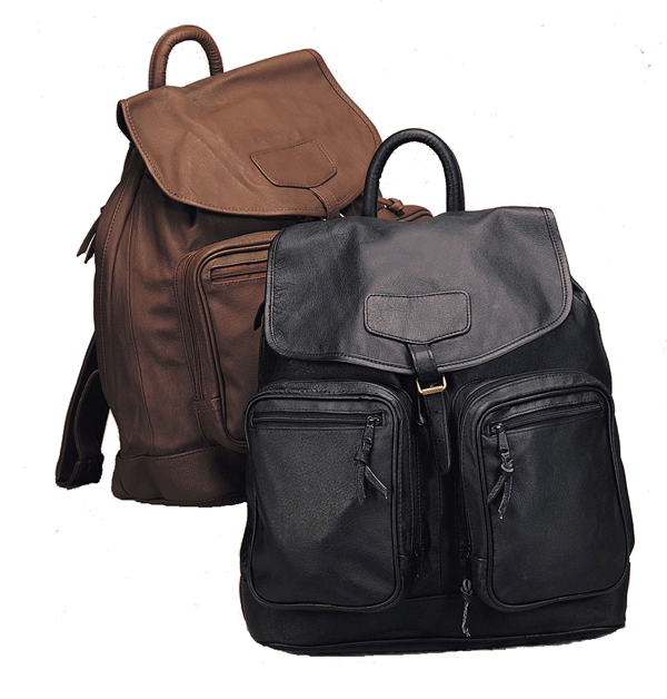 Made of sporty top-grain pigskin, it features a roomy main compartment with a drawstring top, and a side zip opening for easy access. This all-leather case also has two gusseted front pockets, which have additional places for cards and pens. 17" x 14 1/2" x 6 1/2".