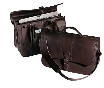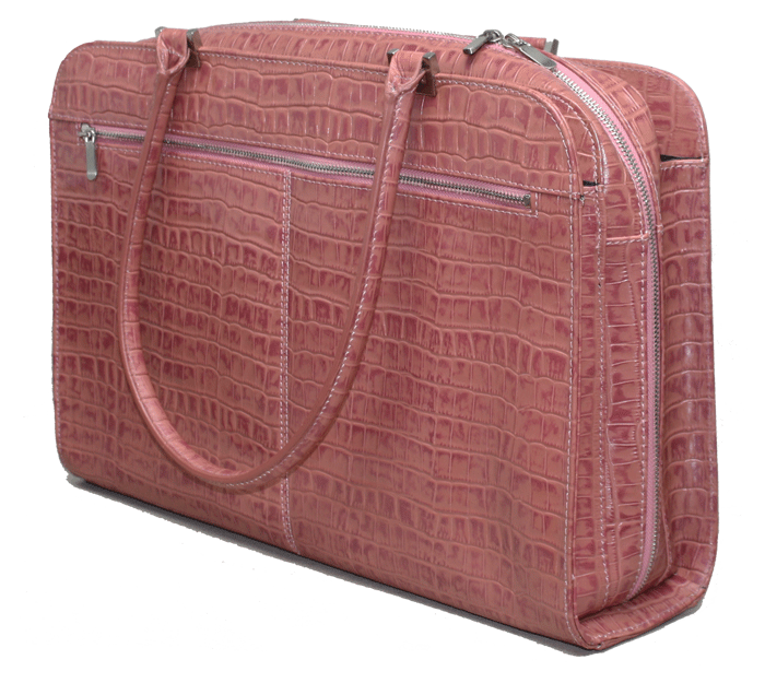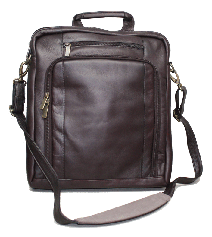 This bag has three compartments. The main one is padded, with a zipper closure, to secure your laptop. The front compartment has a magnetic snap closure and three pockets to organize cell phone, PDA etc. The rear compartment has a magnetic snap closure, plus interior zippered pocket. Back exterior has one large zippered compartment. Brass hardware on the brown bag; nickel hardware on the black and tawny rose. 16 1/2" x 12 1/4" x 4 3/4".